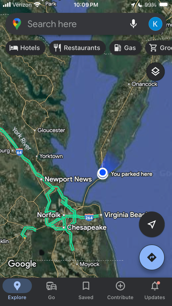 My son’s girlfriend and her family hosted me for a lovely, home cooked meal near Ocean City, MD, where afterwards I continued my journey south on my full size spare tire. I am thankful for the quiet rest area just before the Chesapeake Bay Bridge Tunnel where I could spend the night tucked into my camper.