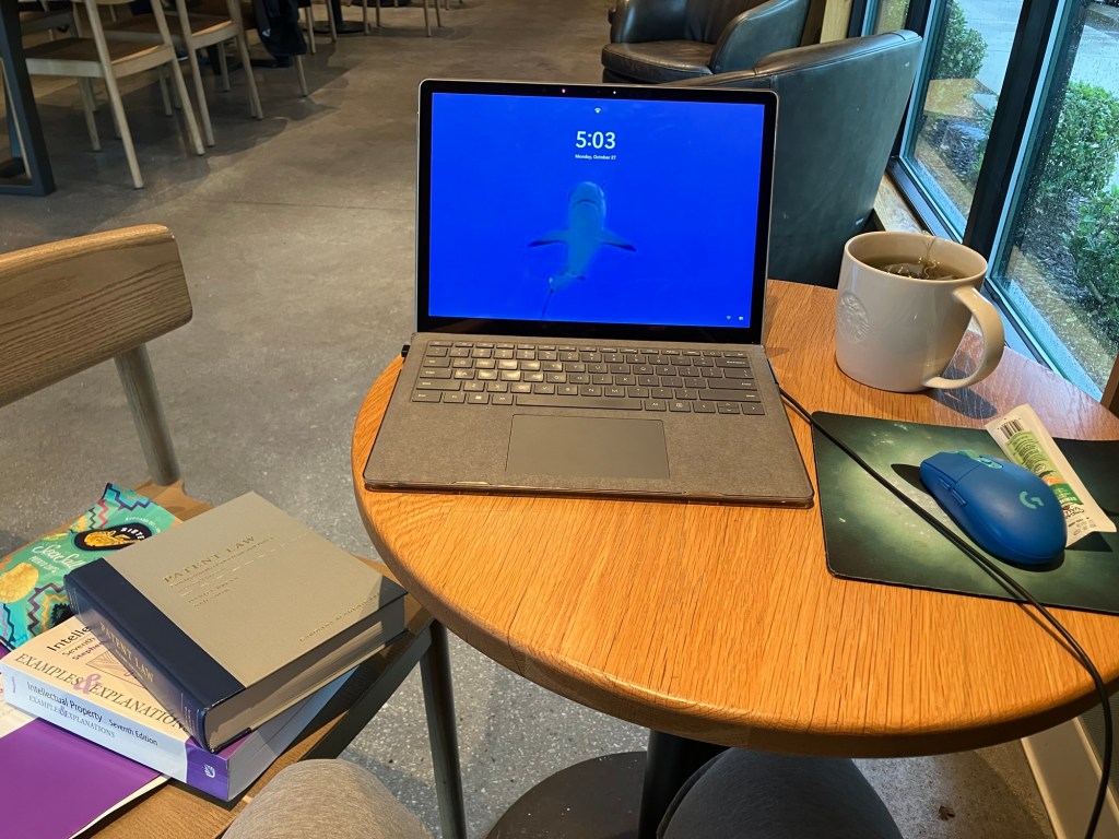 My patent midterm was due the Monday night of my trip. It was a long, cold, and rainy drive through the Carolina’s and I eventually found myself in a corner of a Starbucks drinking hot tea and working on my midterm. I am thankful for the baristas who refilled my tea mug twice.