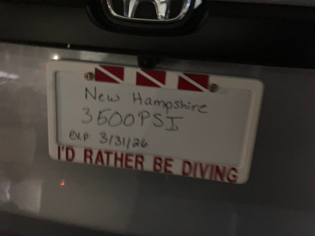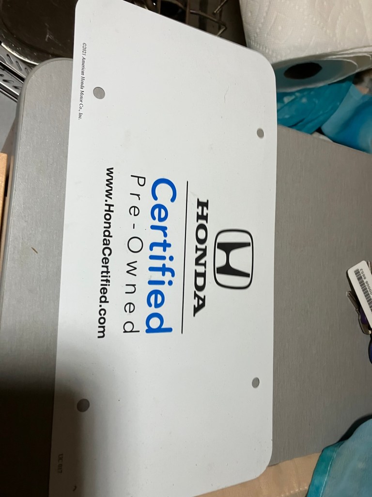 Upon returning to my car, I discovered that it was naked, and somewhere along windblown, rain-soaked 95, lies my cardboard license plate, as my metal ones had not arrived from the state. Given that there was absolutely nothing I could do, I added the plate information to the backside of the plastic insert of my front plate, screwed it into the tailgate and continued on my way. It’s a vanity plate and the state was going to send the metal ones any day. I am thankful that I had that plastic insert, which held up until my actual metal plates arrived and took their rightful places on my new car.